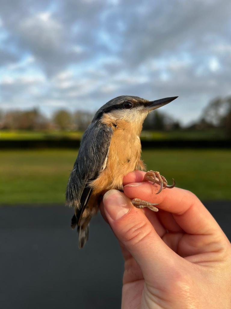 A Eurasian Nuthatch in the hand (handled under BTO guidelines with a licensed ringer)